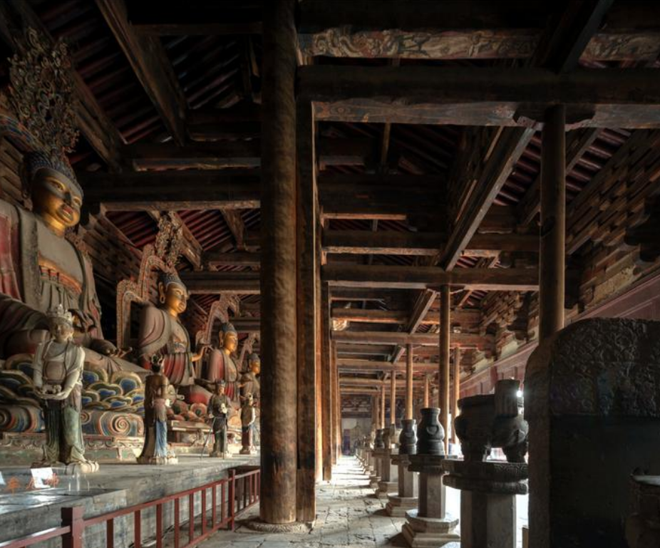 遥望殿内砖筑佛台之上,并坐七尊规模宏大的彩绘泥塑造像,通高9米以上。义县考古和文物保护服务中心主任闻辉发现:“造像木骨架结构中有一整根贯穿头部、身体、莲花座和佛台的中心立柱,这根木‘脊梁’与大殿‘顶梁柱’规格相当,能让造像端坐千年,却不倾不斜。”