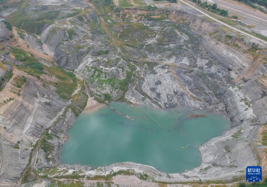 阜新市新邱区曾经废弃的矿坑修复时的场景(2019年10月14日摄)。