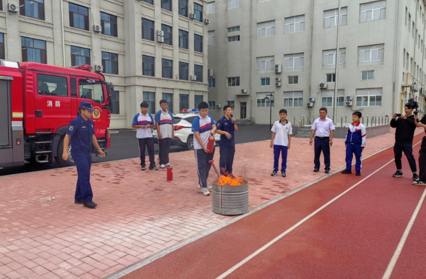 疏散演练课上,随着警报响起,教师立即到达指定岗位,引导教学楼内学生快速疏散。为进一步增强学校师生的消防安全意识,增强自救能力,西市消防大队消防员和金牛山派出所民警向学生们展示各类灭火器,并指导如何使用。