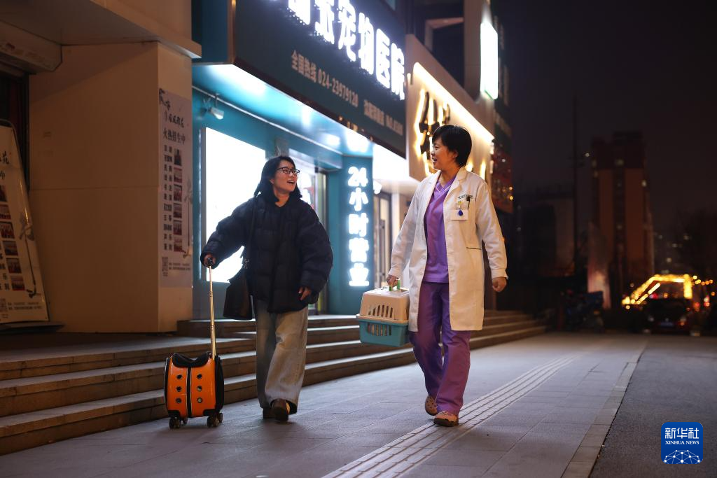 3月20日晚,王蕾(右)将一名救助流浪猫的顾客送出医院。