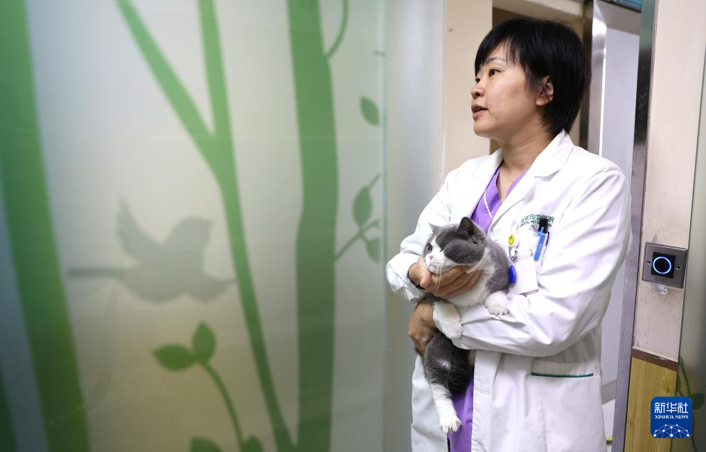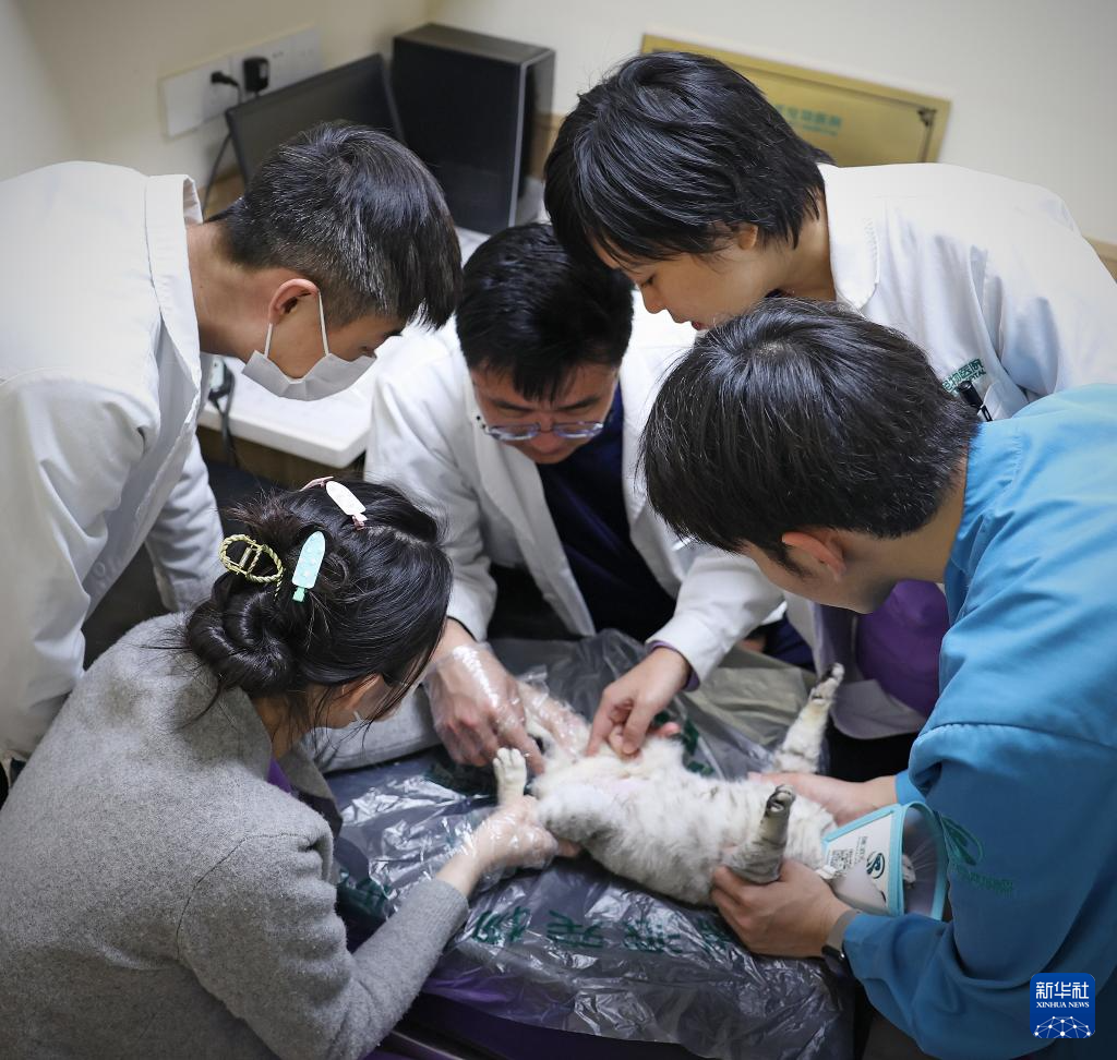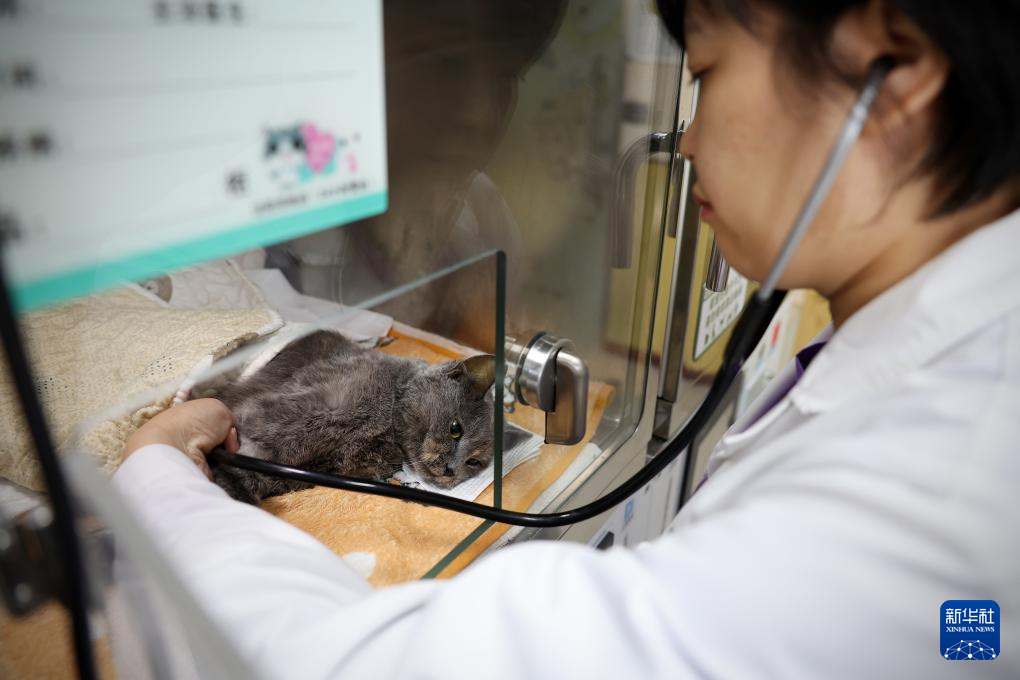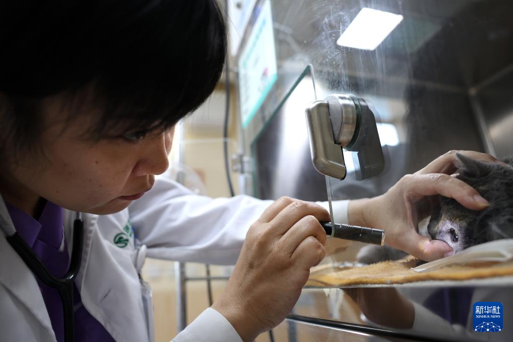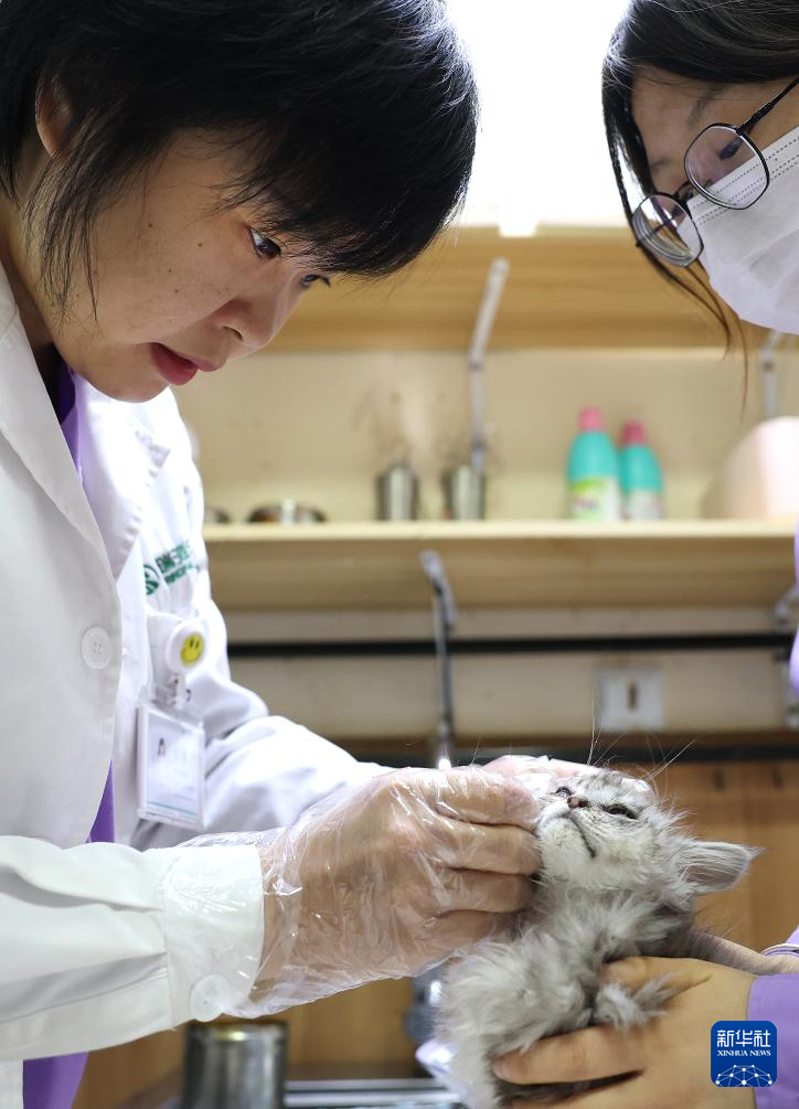 3月19日一早,王蕾(左)和助理医生为一只住院小猫进行晨检。新华社记者 姚剑锋 摄pagebreak