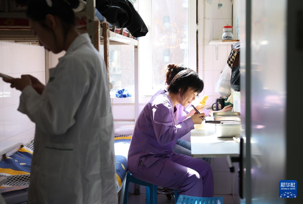 3月19日中午,王蕾(右前)在休息室里吃午饭。新华社记者 姚剑锋 摄pagebreak