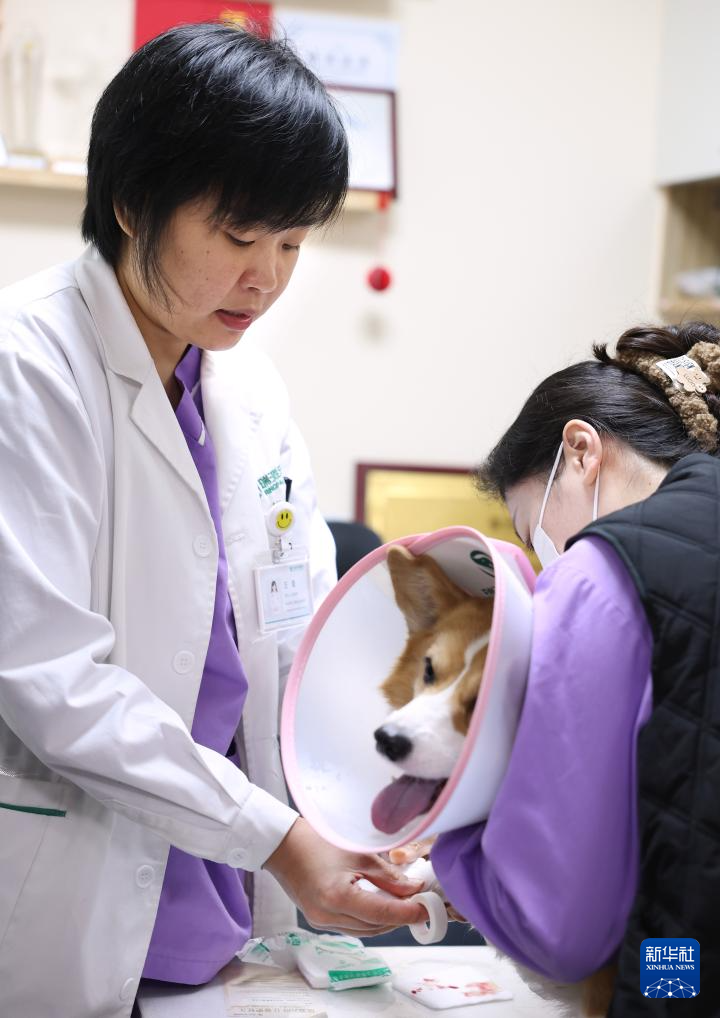 3月19日,王蕾(左)在诊室里给一只爪子受外伤的小狗包扎伤口。新华社记者 姚剑锋 摄pagebreak