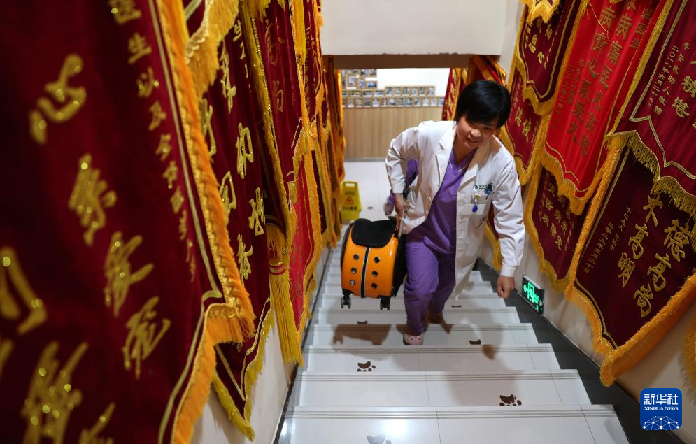 3月18日,王蕾带着一只被救助的流浪小猫上楼准备进行绝育手术。新华社记者 姚剑锋 摄pagebreak
