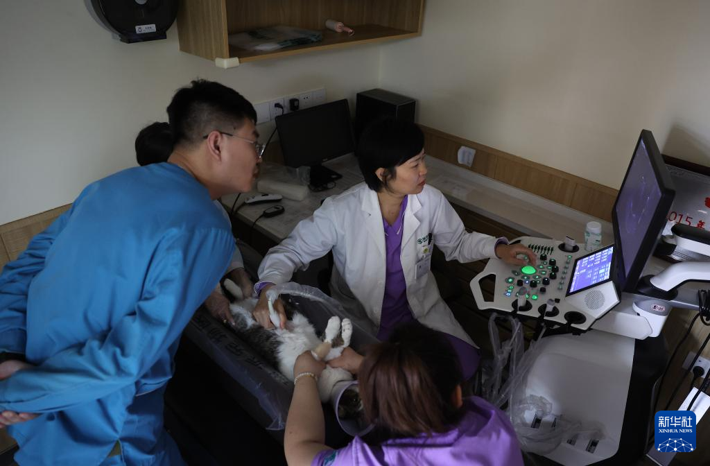 3月20日,王蕾(右上)和刘毅医生(中)、杨波医生(左上)一起在彩超室里对一只小猫进行会诊。新华社记者 姚剑锋 摄