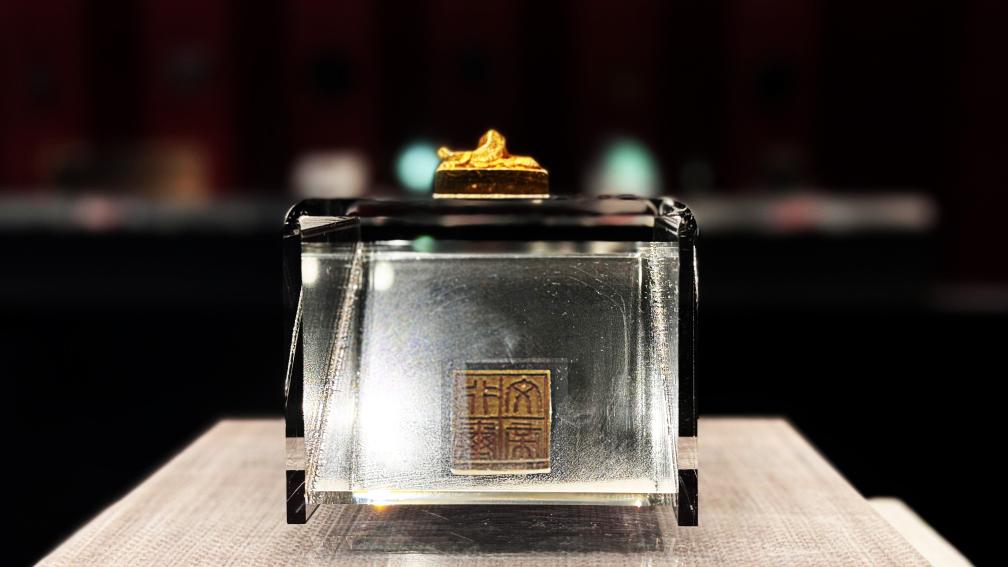展览展出的“文帝行玺”龙钮金印吸引了众多参观者驻足。展览策展人、大连博物馆馆长姜晔说:“此印为方形,饰龙钮,在南越文王墓墓主胸部发现,印面有田字界格,阴刻篆书‘文帝行玺’四字,书体工整、刚劲有力。印钮为一条游龙,龙首伸向印台一角,龙鳞及爪是铸后凿刻的。该印是南越文王的官印。”