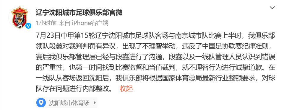 当日23时03分,辽宁沈阳城市足球俱乐部发布公告称,俱乐部领队段鑫对裁判判罚有异议,出现了不理智举动,违反了中国足协联赛纪律准则,赛后俱乐部管理层已经与段鑫进行了沟通。“段鑫以及一线队管理人员认识到错误的严重性,也第一时间找到比赛监督和当值裁判,就不理智行为进行诚挚道歉。在一线队从客场返回沈阳后,俱乐部将根据国家体育总局最新行业整顿要求,对球队存在问题进行内部整改。”