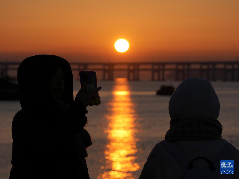 2024年1月1日,人们在辽宁大连星海广场拍摄海上日出。新华社记者 李钢 摄