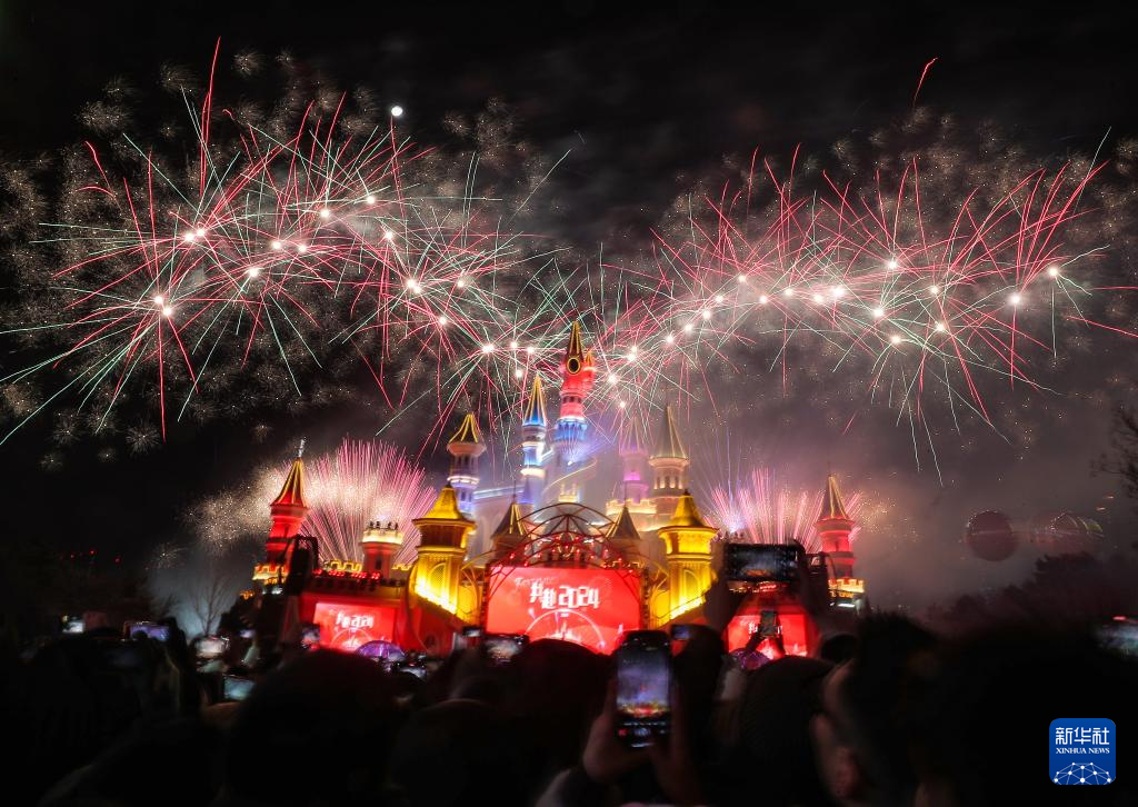 2024年1月1日,游客在沈阳方特欢乐世界观看烟花表演。新华社记者 龙雷 摄