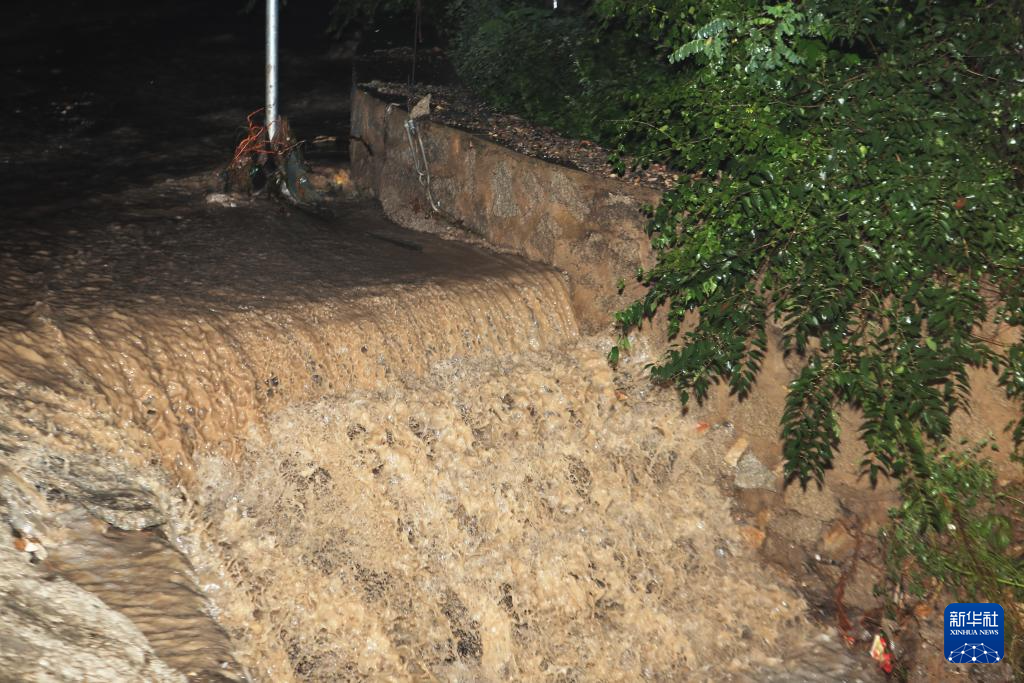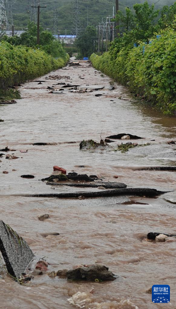 8月20日,在建昌县通往雷家店乡的道路上,积水从山上流下。新华社记者 杨青 摄
