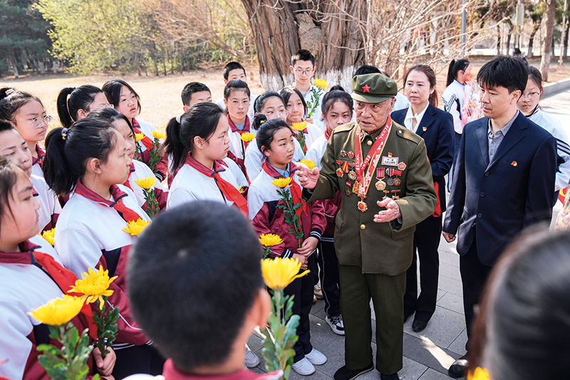 志愿军老兵李维波在沈阳抗美援朝烈士陵园内为学生们讲述战争经历(2023年4月3日摄) 潘昱龙摄/本刊
