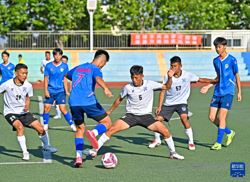 7月14日,在大连育明高中,大连和那曲两地少年在一场足球友谊赛中拼抢。新华社记者 周华 摄
