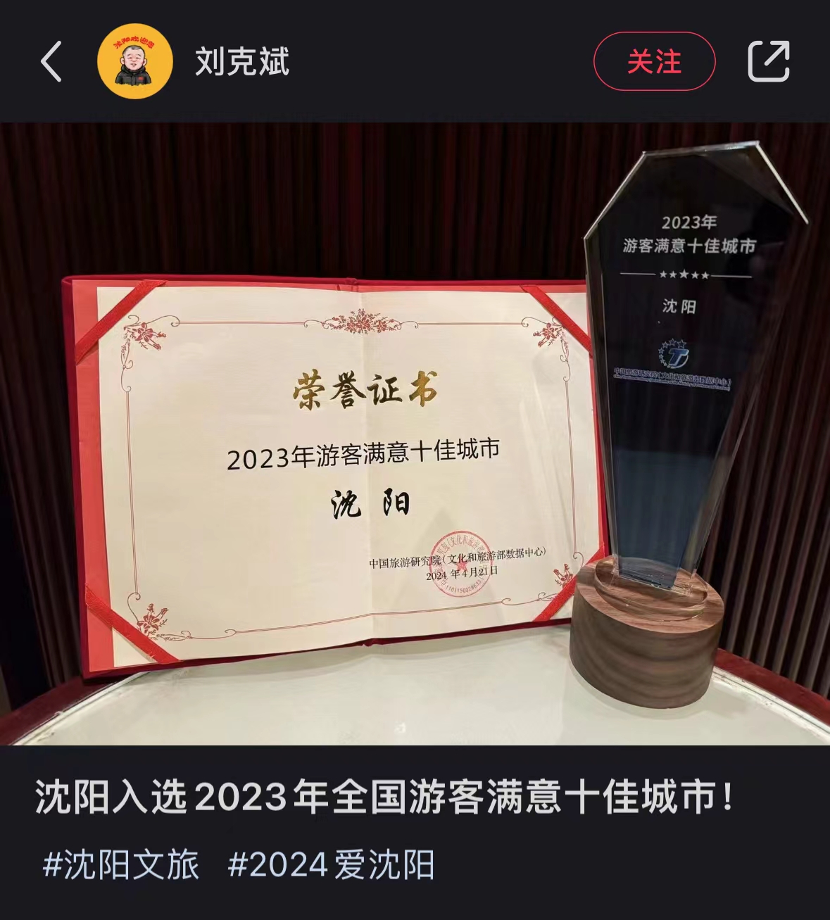 刘克斌在社交平台晒出沈阳入选2023年全国游客满意十佳城市