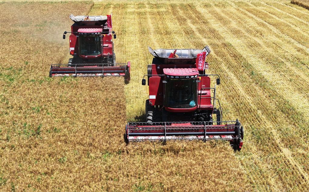 在辽宁省阜新市彰武县,收割机在收获小麦。(受访者供图)
