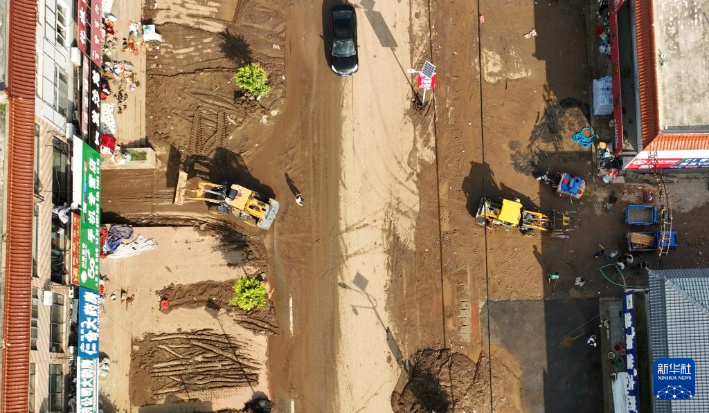 8月21日,在建昌县黑山科乡,救援车辆在清理道路淤泥(无人机照片)。新华社记者 杨青 摄pagebreak