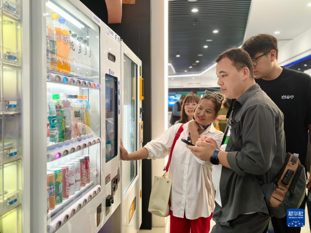 7月2日,上合组织国家媒体代表在大连冰山集团体验自动售卖机。新华社记者温馨 摄
