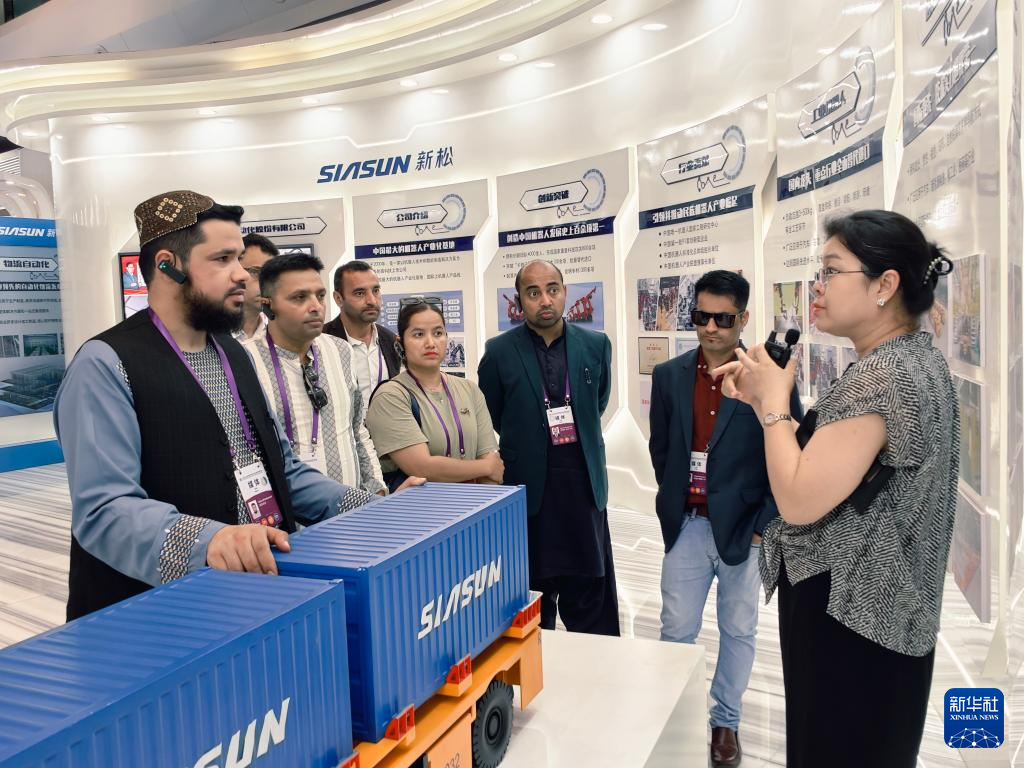 7月3日,上合组织国家媒体代表在沈阳新松机器人自动化股份有限公司参观采访。新华社记者温馨 摄