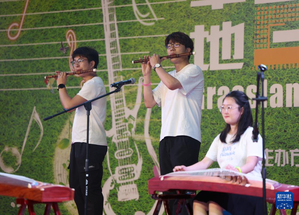 6月19日,在沈阳工学院2023草地音乐节,民乐社的同学进行乐器演奏。新华社记者 杨青 摄