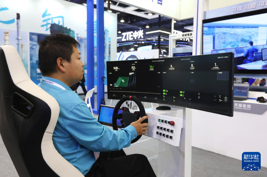 10月18日,参会企业工作人员在演示无人驾驶远程驾驶舱。新华社记者 陈为 摄