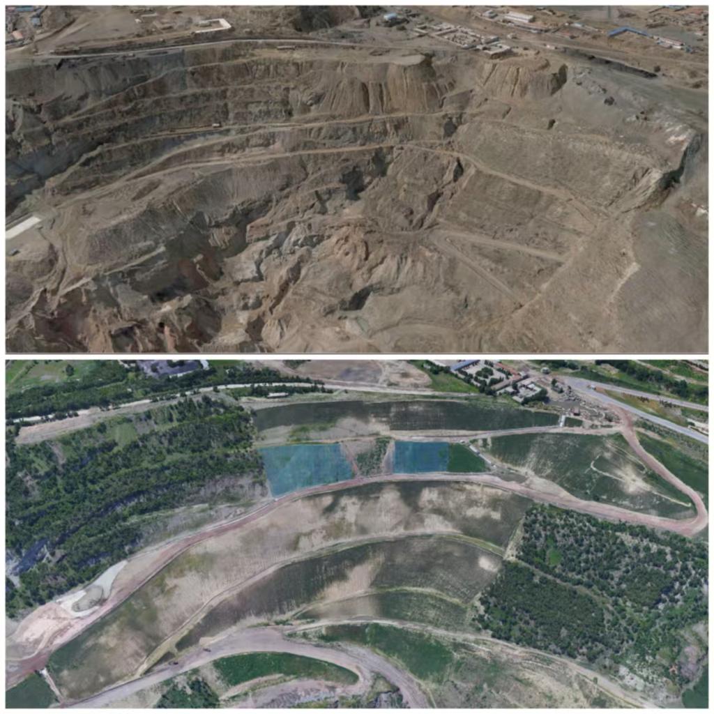 拼版照片:治理前后的海州露天矿南帮对比图。(受访单位供图)