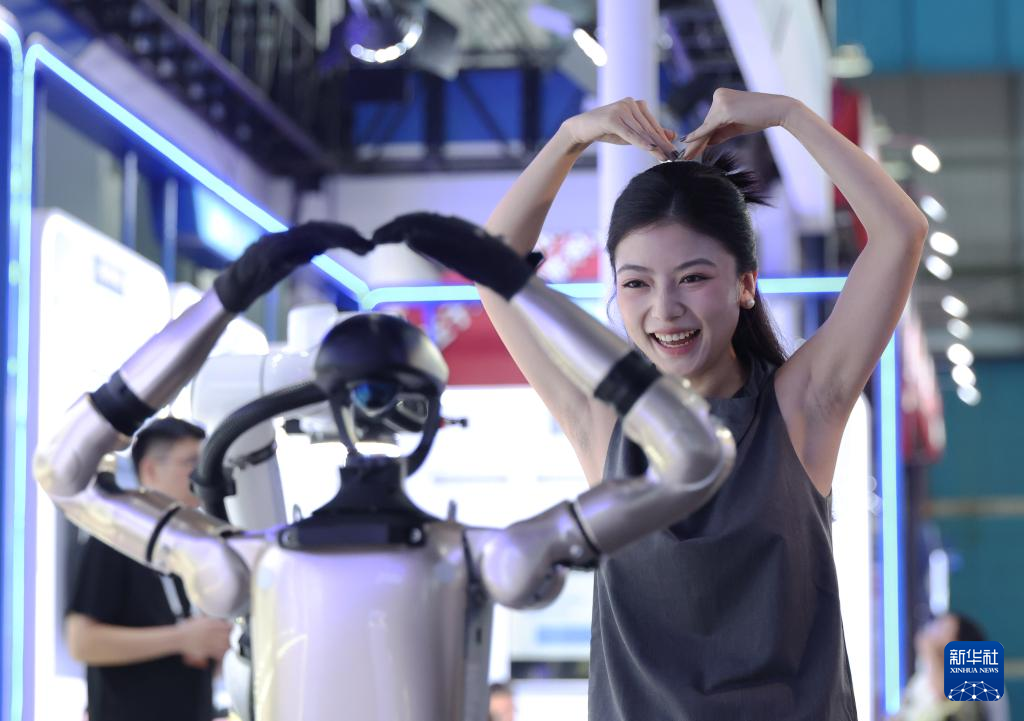 9月6日,观众在2025全球工业互联网大会现场与机器人互动。