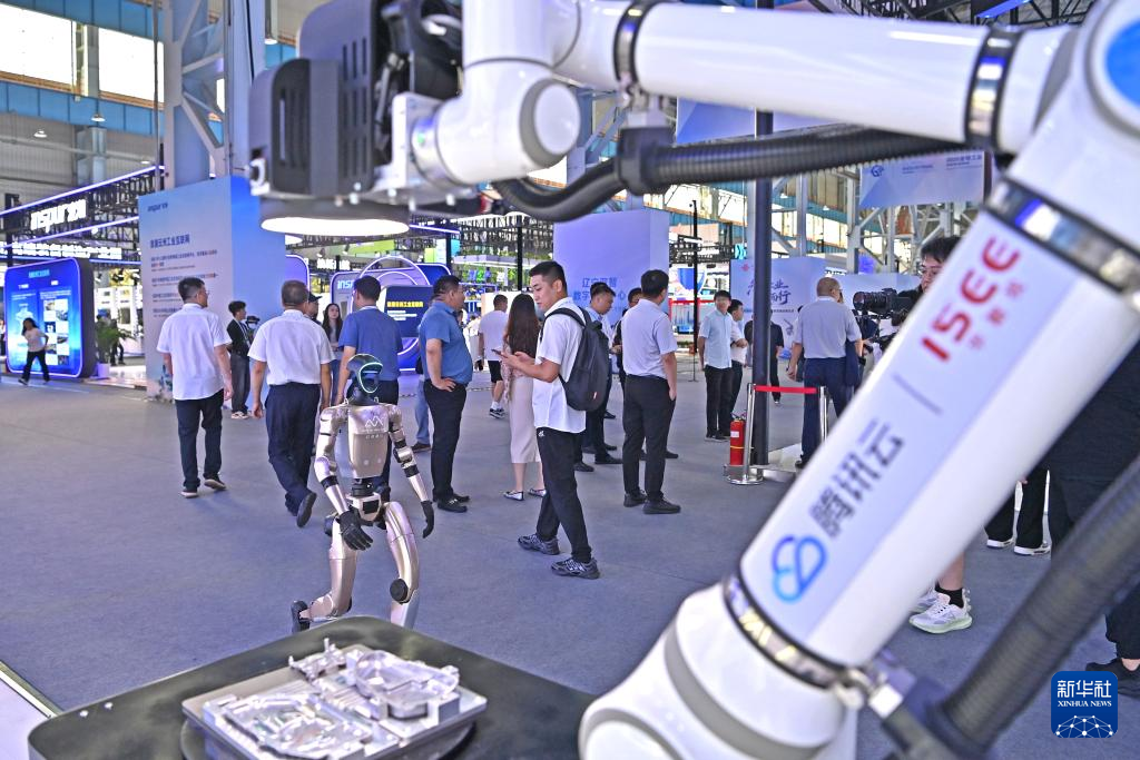 9月6日,在2025全球工业互联网大会展览区,参会嘉宾和智能机器人互动。