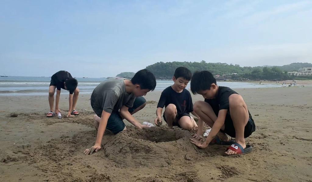 夕阳落进平静的海湾,暮归的渔船三三两两,给这座本就安静的小岛带来了独特的美好。岸边,孩子们挖沙,嬉戏喧闹;大人们露营,一杯啤酒,几根烤串,暂时远离了都市的喧嚣。一群玩耍的孩子对记者说:“这里的海边不拥挤,玩得尽兴。”