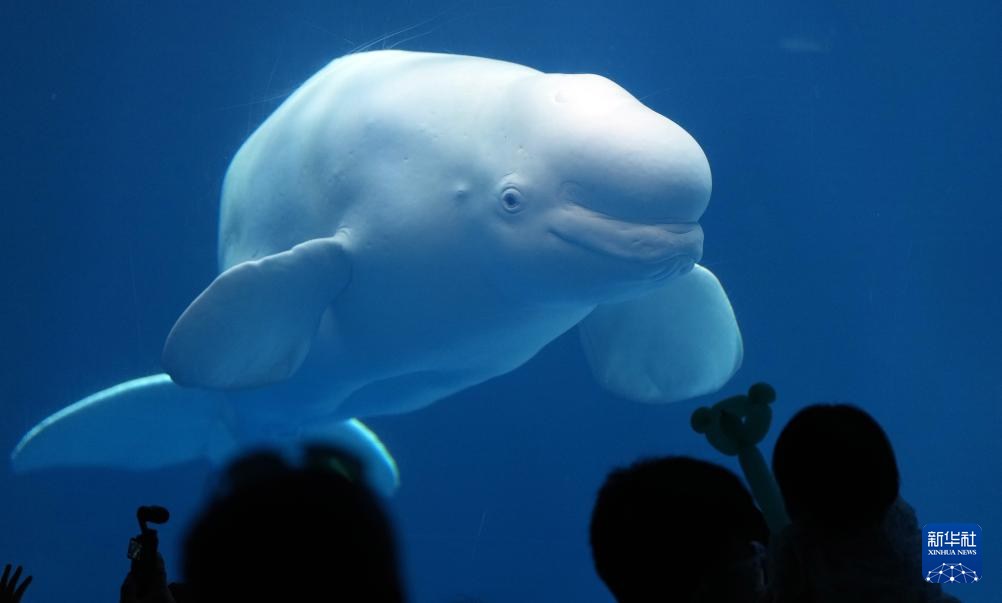 5月22日,游客在大连圣亚海洋世界观赏白鲸。