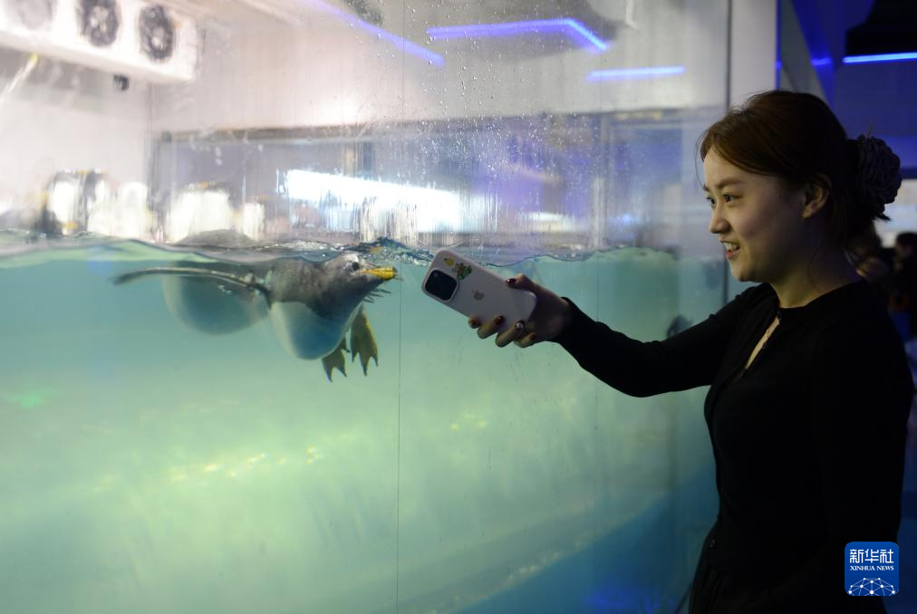 5月22日,游客在大连圣亚海洋世界与企鹅互动。