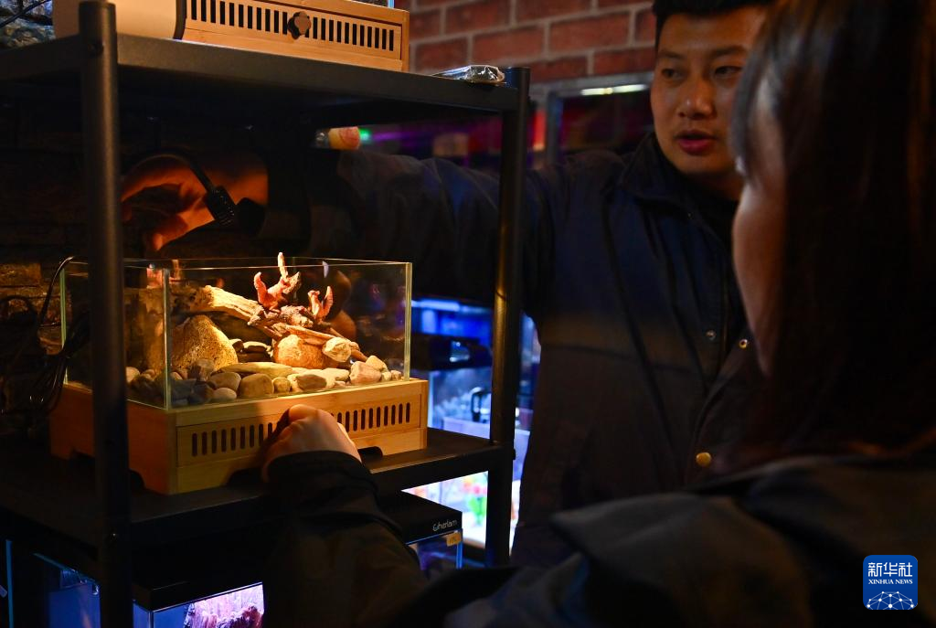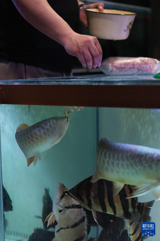 4月10日,在鞍山三台子观赏鱼交易中心,一名店主在喂鱼。