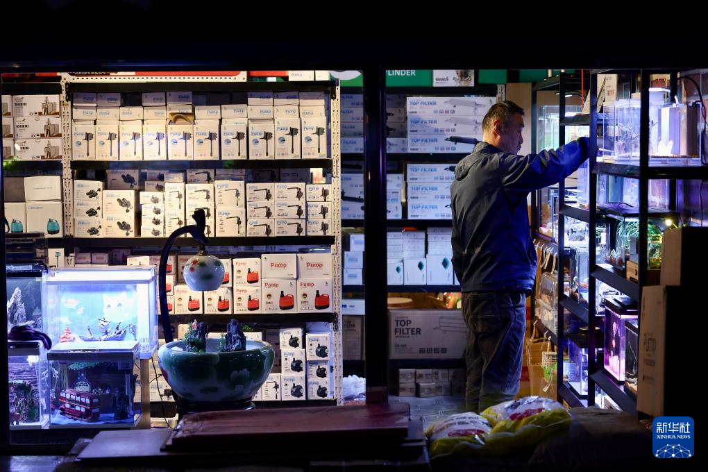4月10日,在鞍山三台子观赏鱼交易中心,一名店主在布置鱼缸。