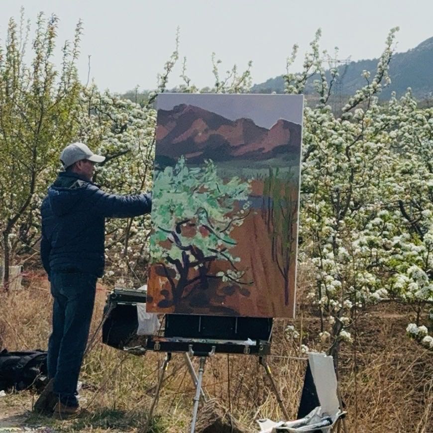 作为本次采风活动的第一站,北镇市以其梨香遍野的盛景和悠久的历史文化底蕴引得油画大师纷纷留下墨宝。在医巫闾山的古刹背后,中国美术家协会国家重大题材美术创作艺委会委员、清华大学美术学院教授王铁牛用厚涂与细线勾画山景,一颗颗生长在石缝中的树木跃然纸上,挺立在硬朗的北方山石之间。置身这样的景色中,王铁牛深深感受到家乡的归属感。