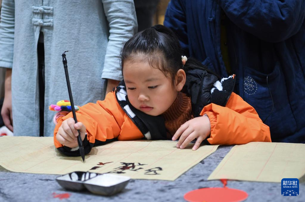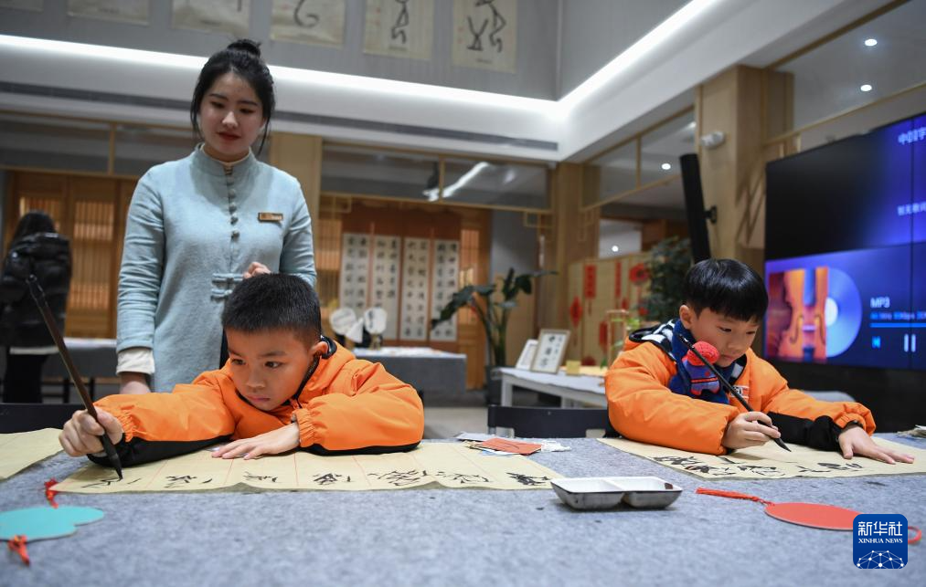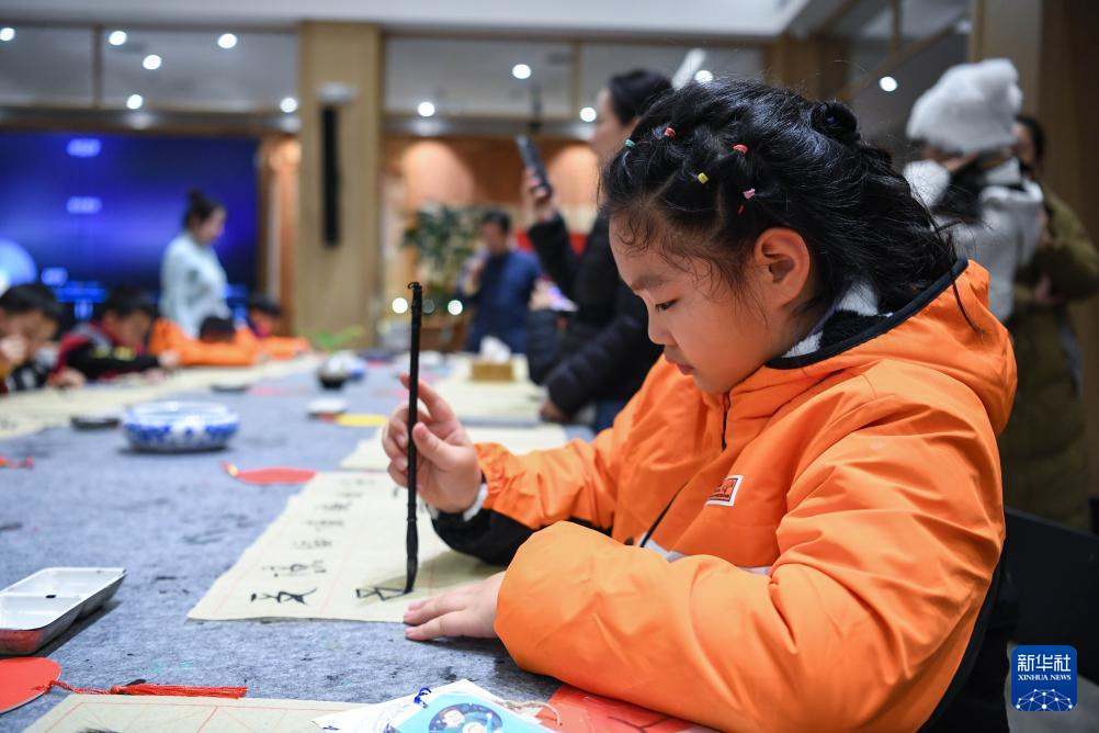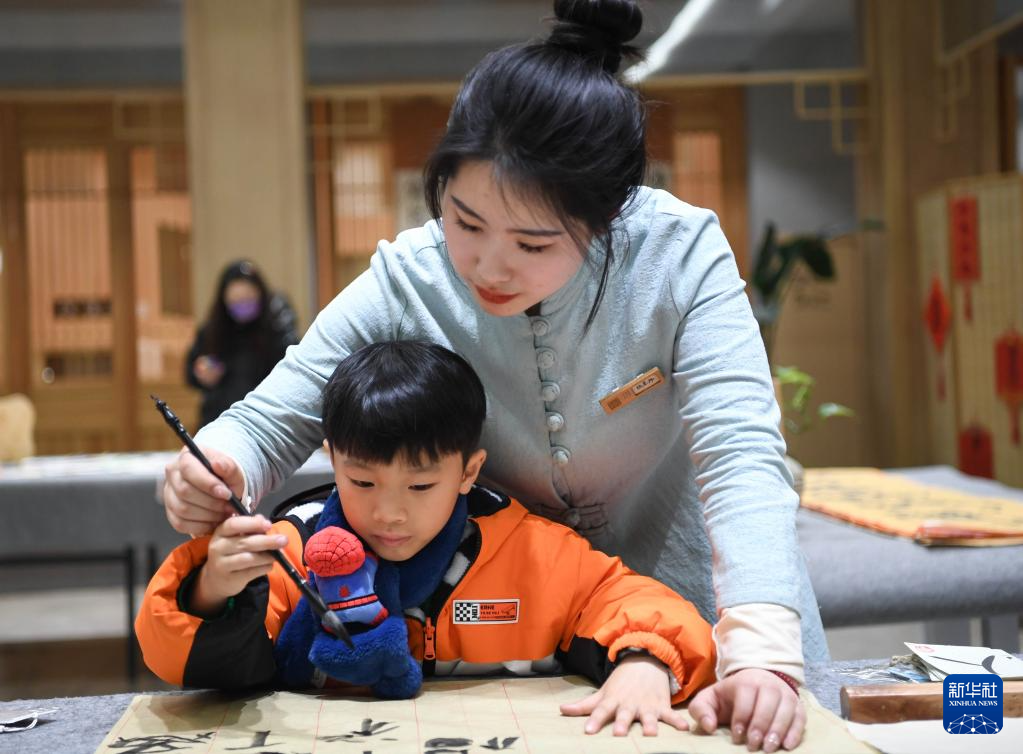 1月7日,“小沃柑”在沈阳老北市汉字主题书房体验书法。新华社记者 龙雷 摄