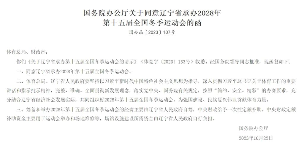 根据函件要求,国家体育总局、辽宁省人民政府应按照“简约、安全、精彩”的办赛要求,充分结合辽宁省经济社会发展实际,共同组织好2028年第十五届全国冬季运动会,为强国建设、民族复兴伟业贡献体育力量。