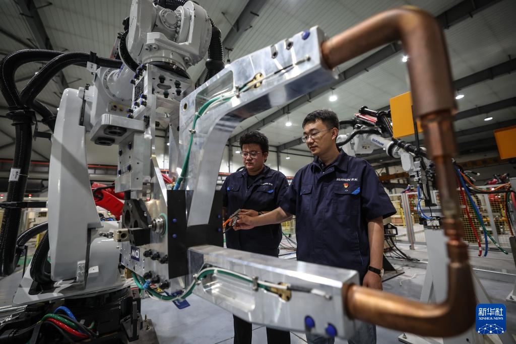 6月3日,沈阳新松机器人自动化股份有限公司的机器人研发工程师在调试点焊机器人。