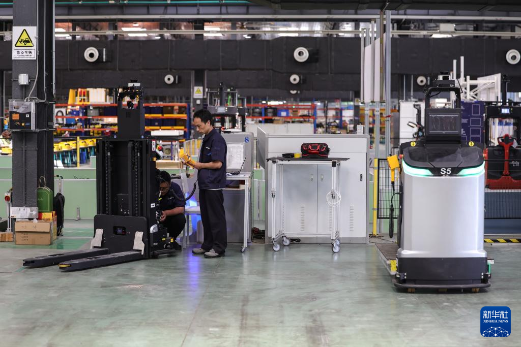 6月4日,沈阳新松机器人自动化股份有限公司的机器人研发工程师在调试叉式移动机器人。