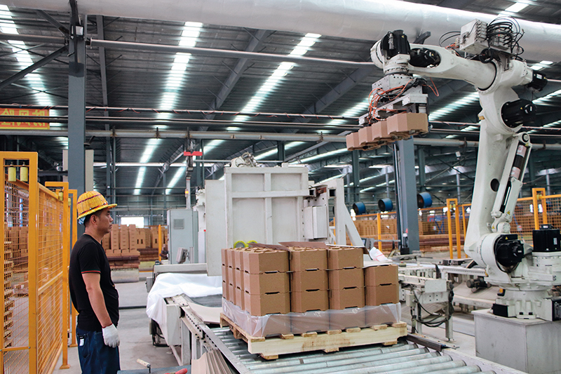 后英集团海城市胜辉耐火材料制造有限公司生产车间里,机械臂抓取耐火砖(资料照片)海城市委宣传部供图
