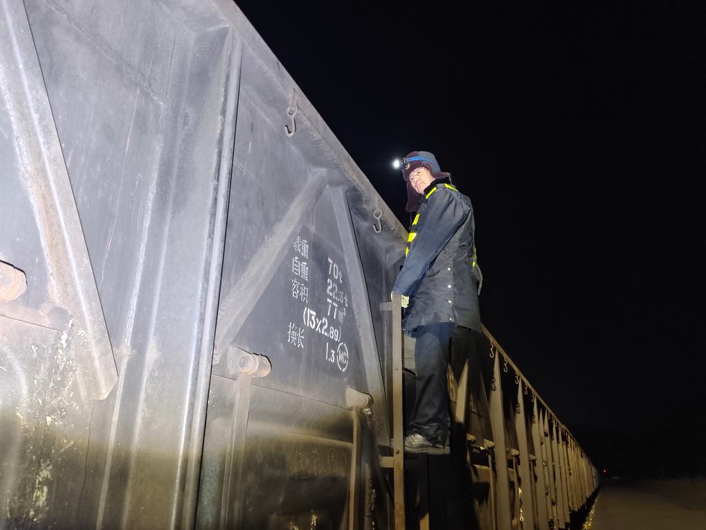 每次货运列车到站后,秦国飞都逐个车爬上去检查,也因此练就了“眼睛当尺子”的本领,确保每趟列车不超限、不偏载。