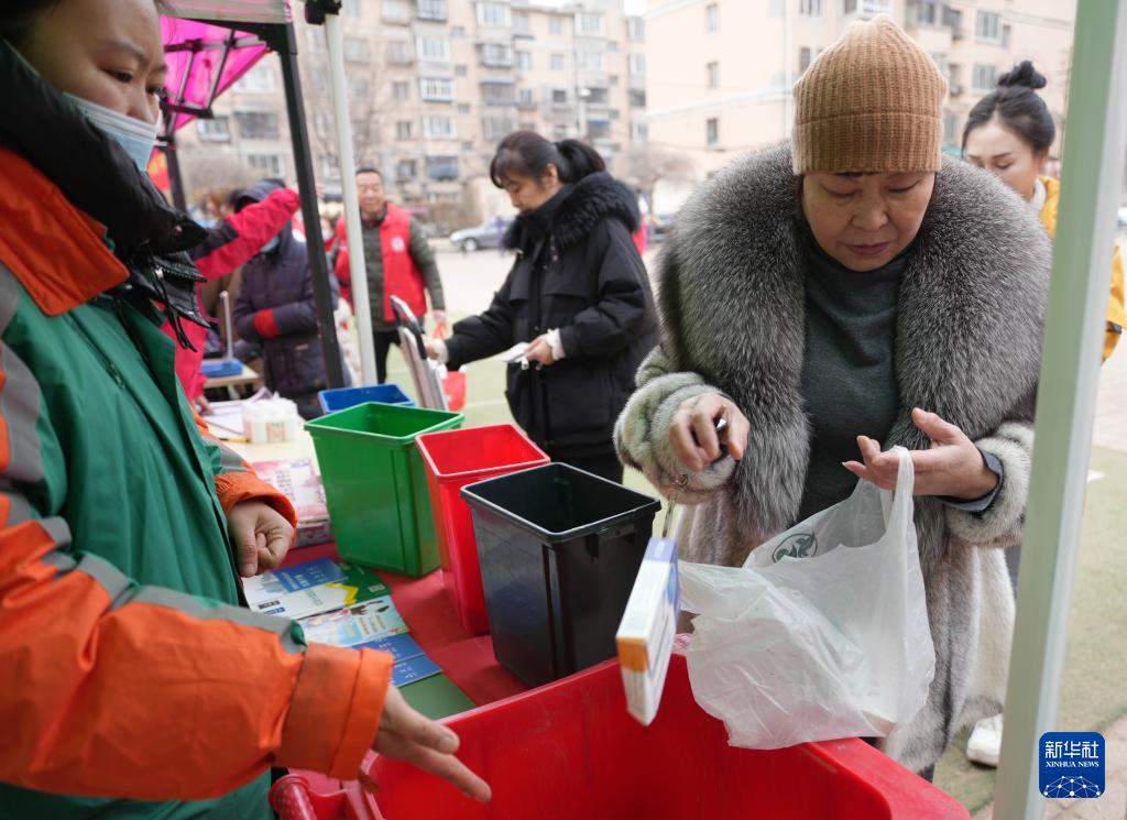 3月4日,在沈阳市铁西区重工新村社区广场,志愿者引导居民分类上交过期药品、废旧电池等,兑换实用的日用品。