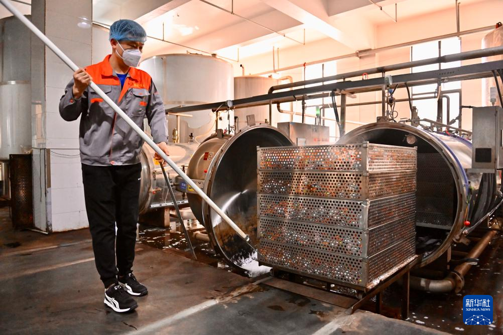 4月24日,在位于辽阳市的辽宁鑫金科技实业集团有限公司的加工厂内,工人在查看煮熟的鸭蛋。