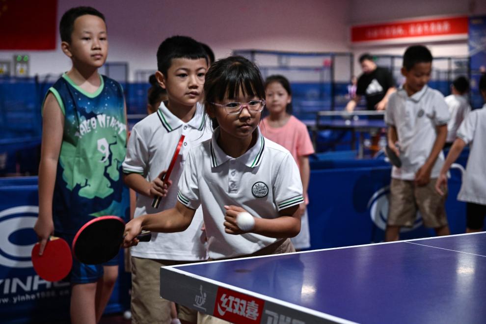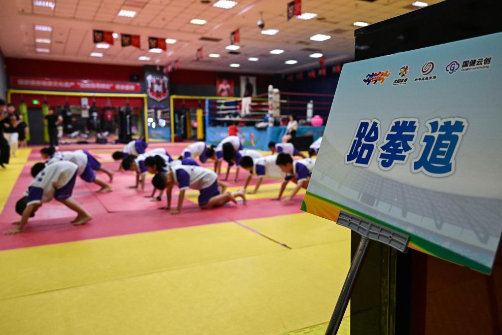 7月15日,学生们在活动前进行热身训练。新华社发(贾轶程摄)