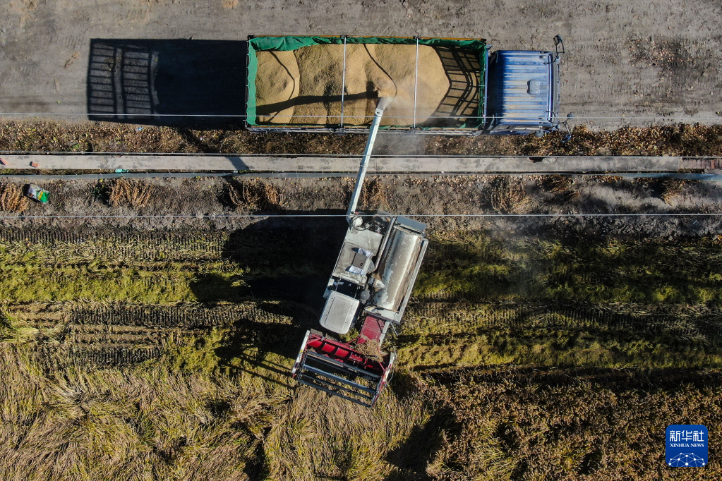 11月3日,农户在盘锦市大洼区王家街道兴海村将收割的水稻装车(无人机照片)。新华社记者潘昱龙 摄