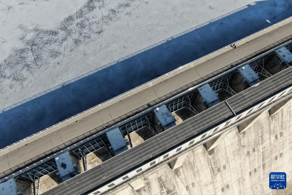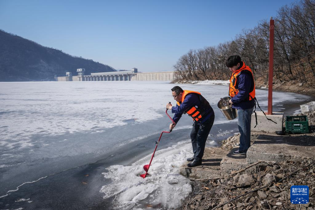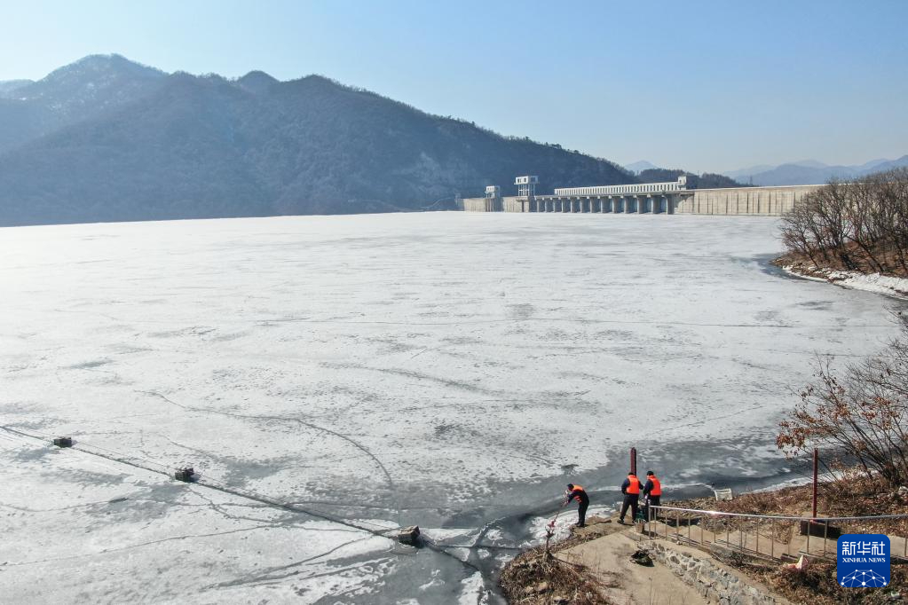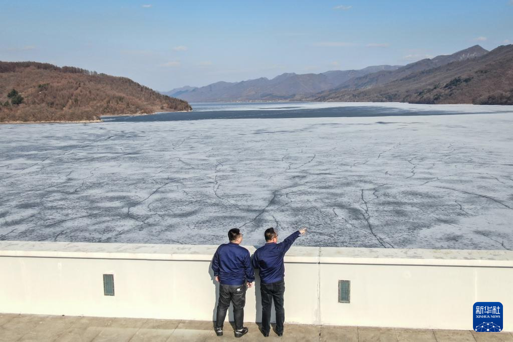 3月20日,崔兵与同事在观音阁水库查看冰面的融化情况(无人机照片)。新华社记者 潘昱龙 摄pagebreak
