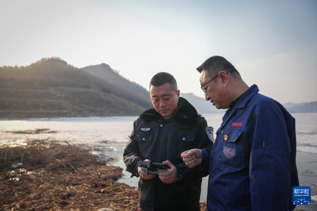 3月20日,崔兵(右)与观音阁水库马城子护库站的护库队员使用无人机进行巡查工作。新华社记者 潘昱龙 摄