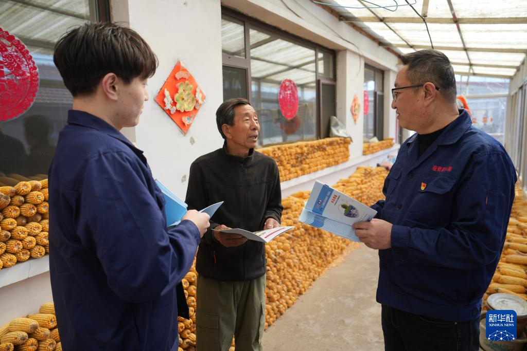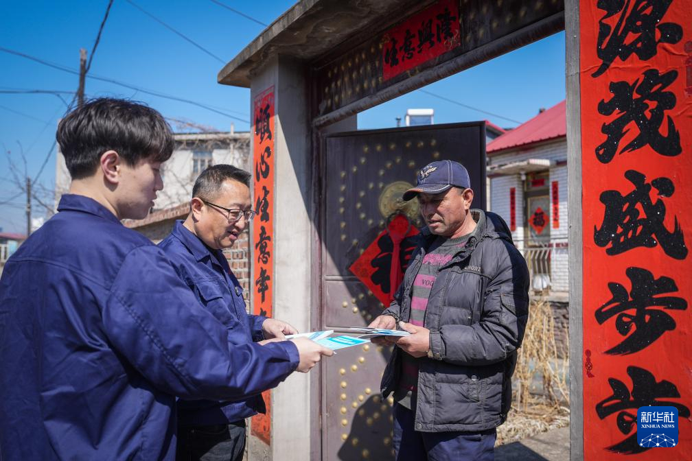3月21日,崔兵(中)与同事在观音阁水库附近的本溪县上堡村为村民发放水利相关科普材料。新华社记者 潘昱龙 摄pagebreak