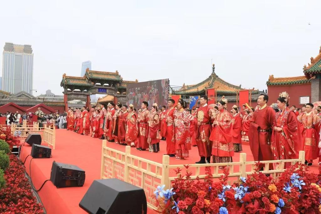 活动现场还举办中式婚礼游园会,展出婚书、定情信物、请柬等婚俗物品,邀请专家现场讲解婚俗文化,设置投壶等传统互动体验;举办“有囍事”婚礼微型市集,展出非遗、文创和国潮好物,搭建“月老办事处”即婚姻咨询处,现场回答新人及观众相关问题。活动力求在传承中国传统礼仪文化的同时,倡导文明节俭的婚庆新风,向全社会传递向上向善、互敬互爱、责任担当的婚姻家庭观。