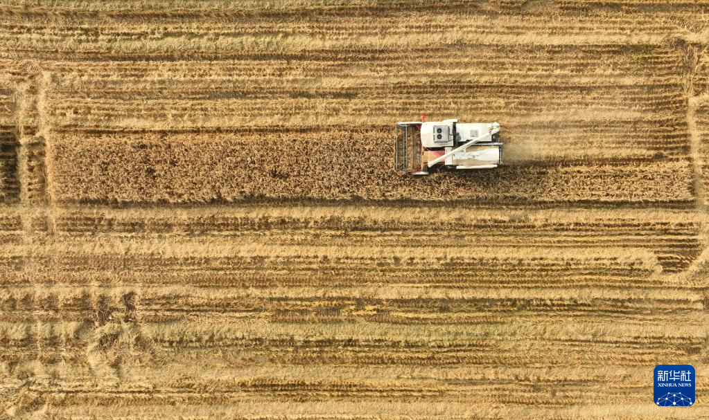 10月23日,水稻收割机在彰武县大冷镇上三家子村的稻田中收割水稻(无人机照片)。新华社记者 龙雷 摄