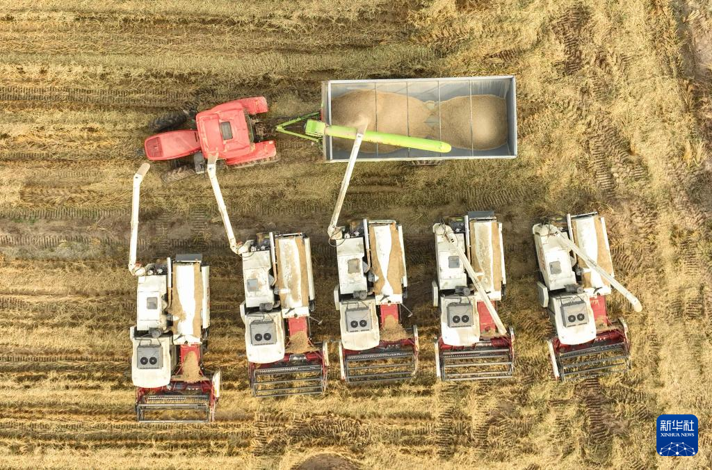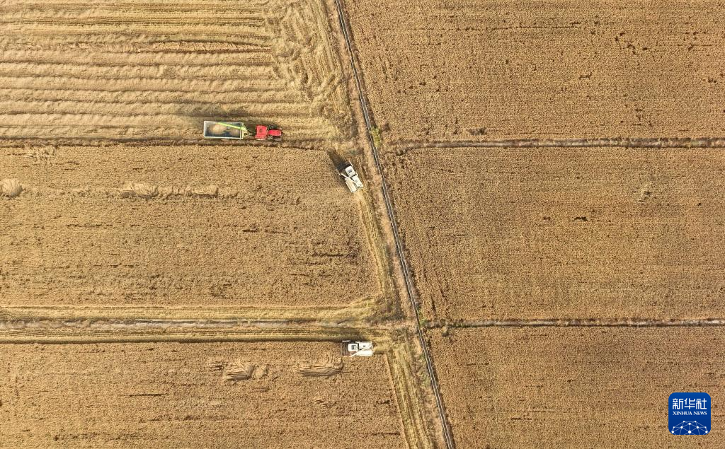 10月23日,水稻收割机在彰武县大冷镇上三家子村的稻田中将水稻装车(无人机照片)。新华社记者 龙雷 摄pagebreak