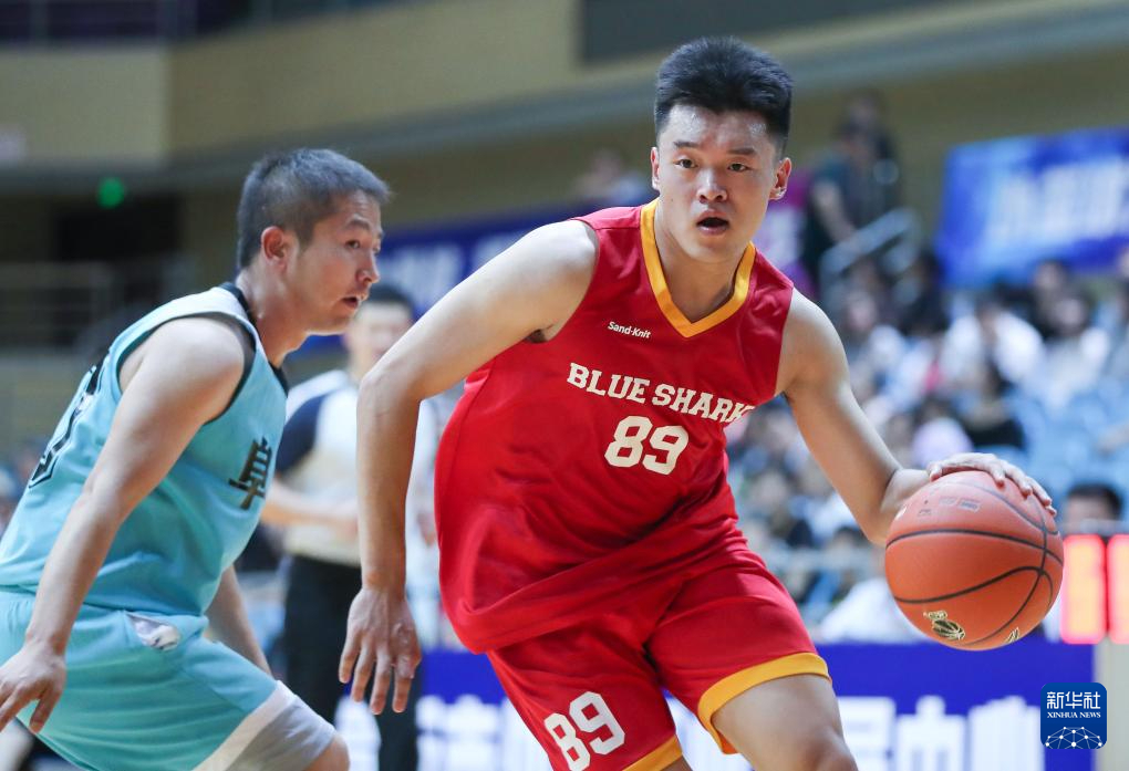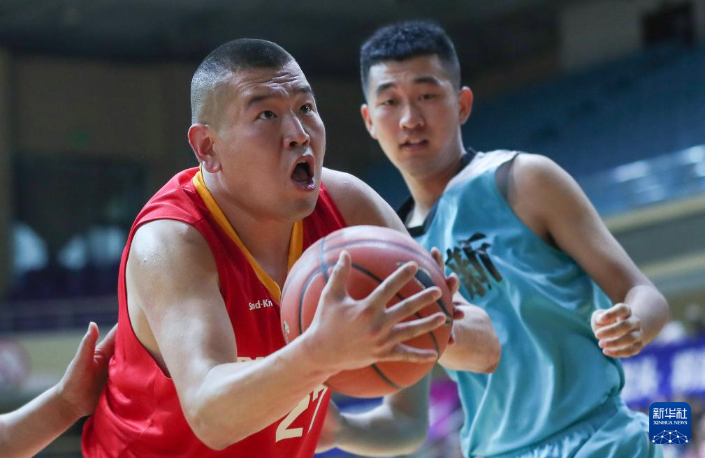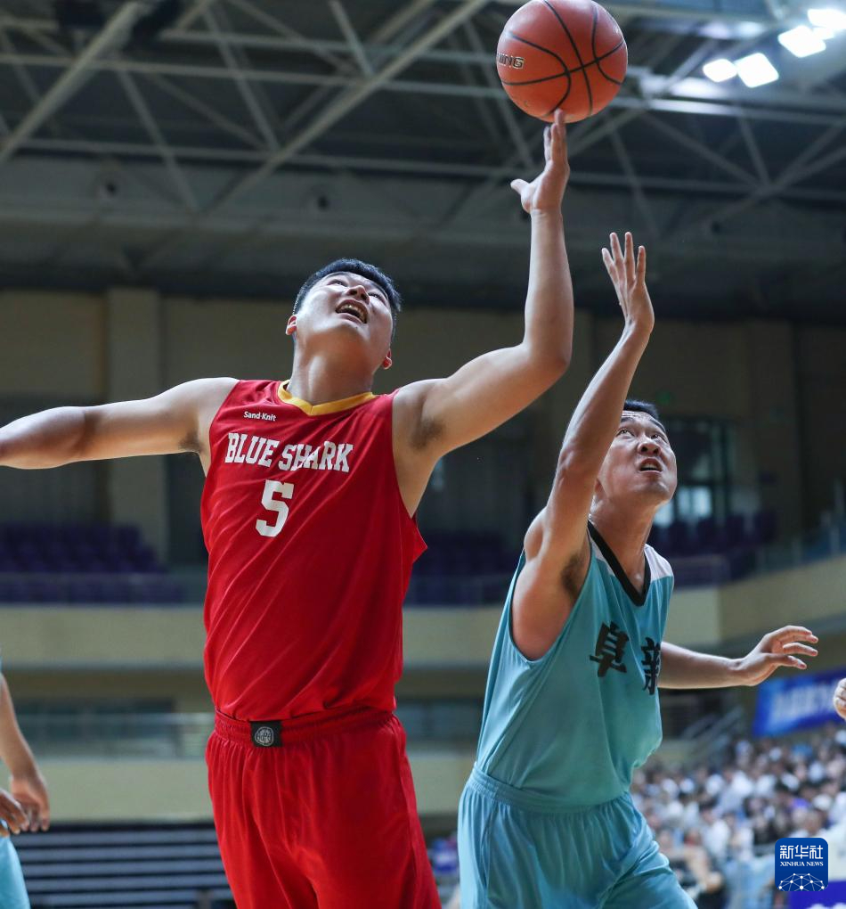 8月8日,蓝鲨俱乐部球员党洪峰(左)在开幕式的篮球表演赛中拼抢。新华社记者 龙雷 摄pagebreak