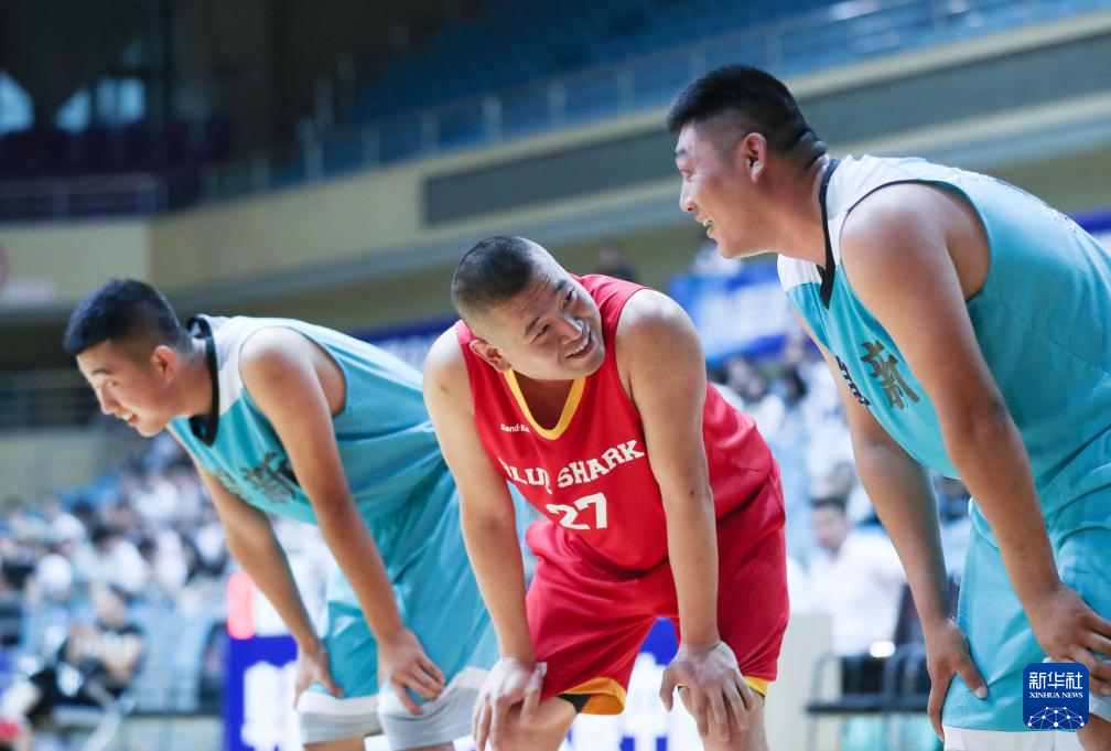 8月8日,蓝鲨俱乐部球员周洋(中)与彰武县苇子沟镇队球员在开幕式的篮球表演赛中交流。新华社记者 龙雷 摄pagebreak